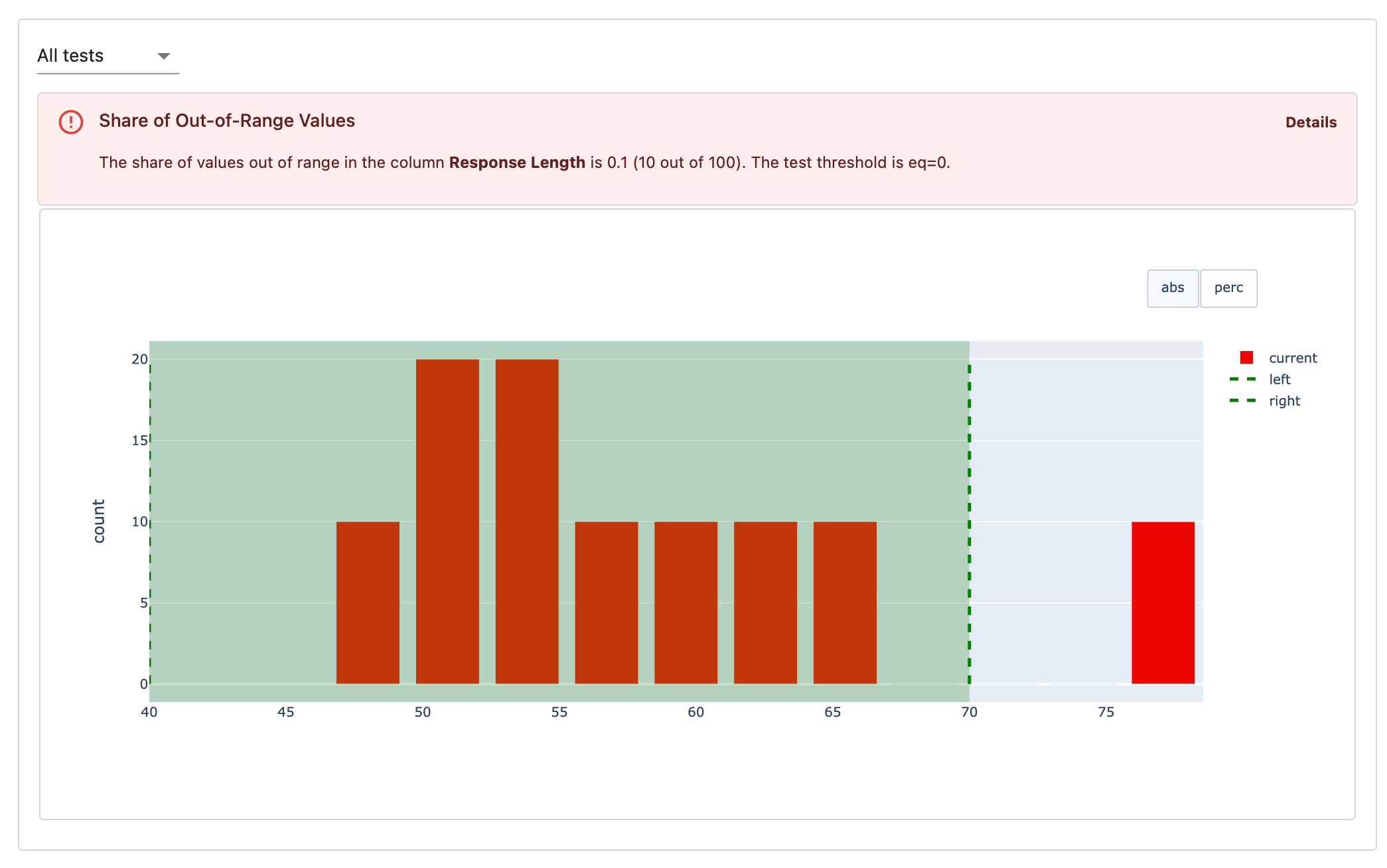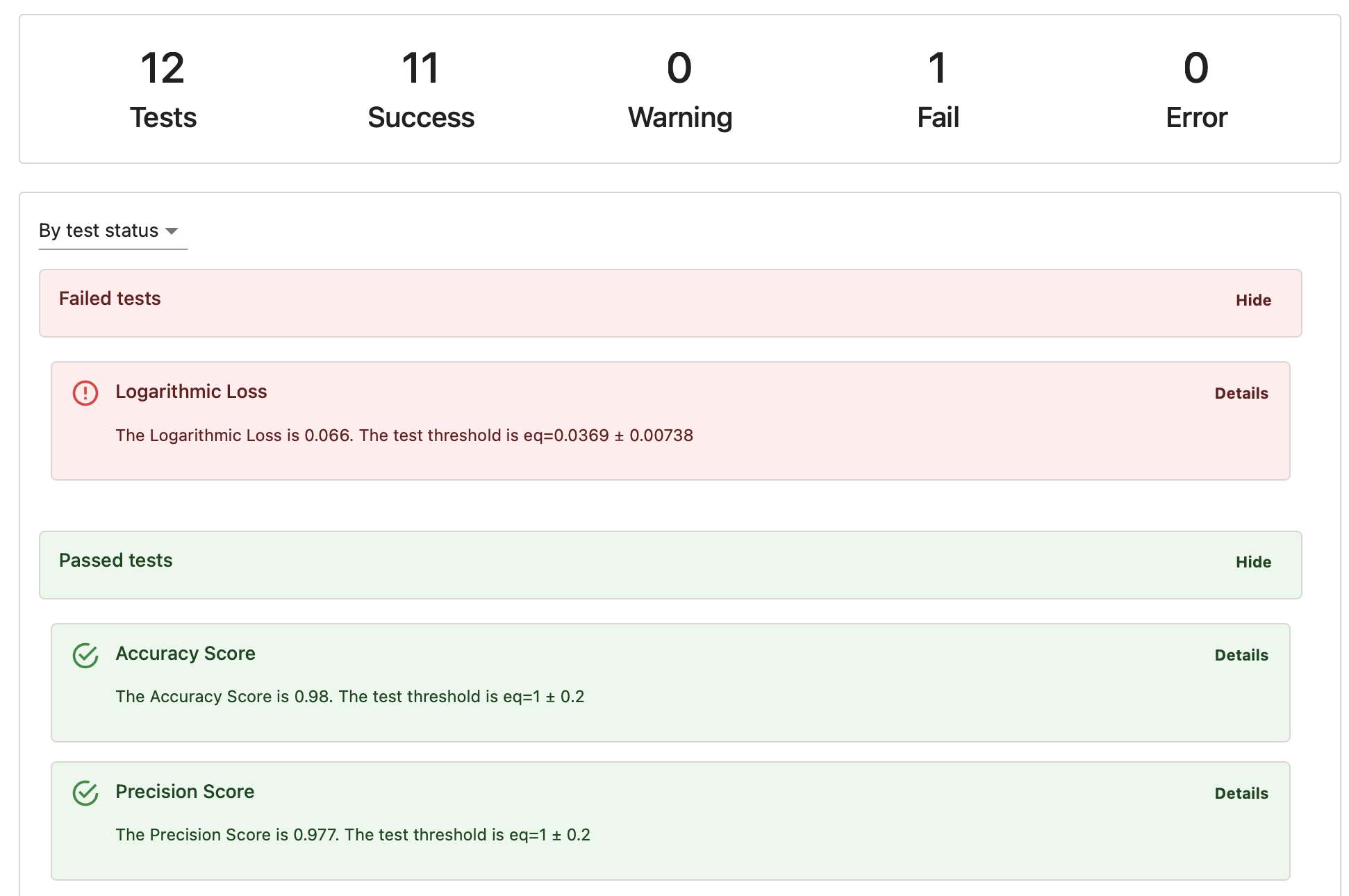 Reports are great for analysis and debugging, or logging metrics during monitoring. However, in many cases, you don’t want to review all the scores but run a conditional check to confirm that nothing is off. In this case, Tests are a great option.Tests