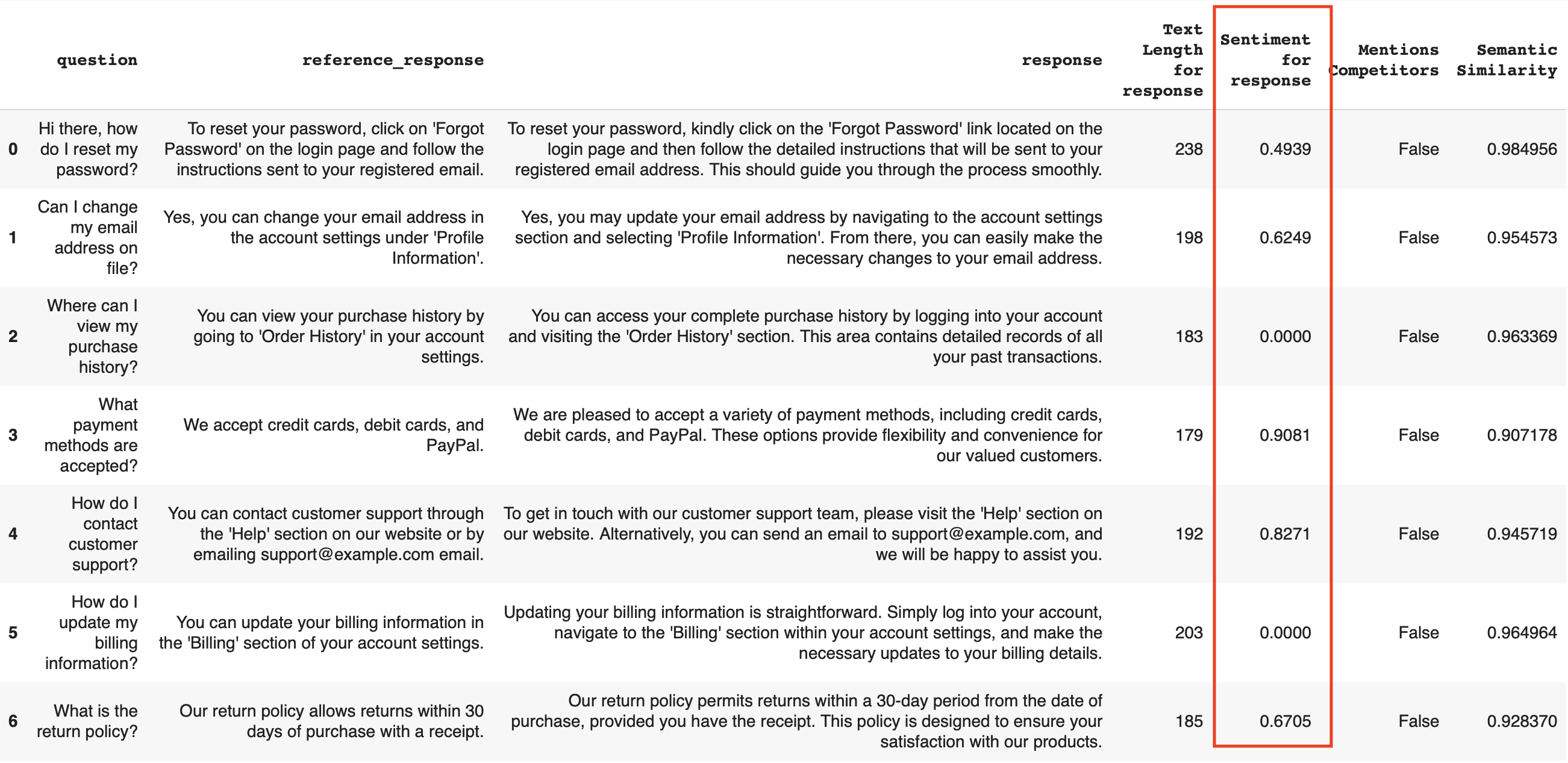 Descriptors can also use two texts at once, like checking SemanticSimilarity between two columns to compare new response to the reference one.
