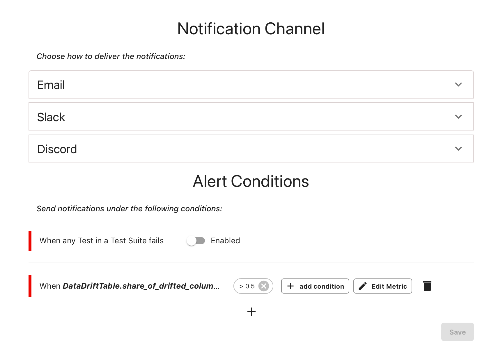If you use Tests (conditional checks) in your Project, you can tie alerting to the failed Tests in a Test Suite. Toggle this option on the Alerts page. Evidently will set an alert to the defined channel if any of the Tests fail.Custom conditions