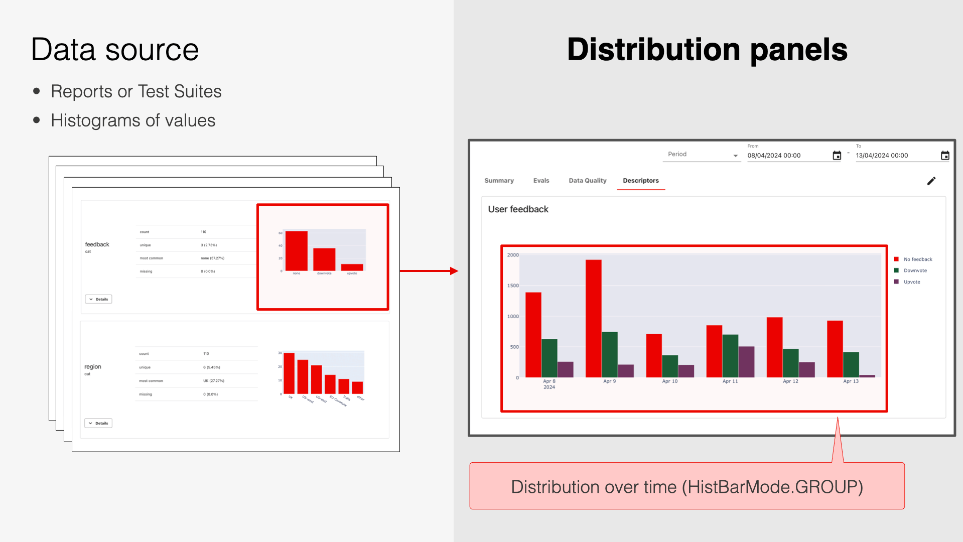 DashboardPanelPlot withPlotType.HISTOGRAM) shows the distribution of the selected values from all Reports. Each source Report contains a single value (e.g., a “mean value”). A Distribution Panel (DashboardPanelDistribution) shows how a distribution changes over time. Each source Report contains a histogram (e.g. frequency of different categories).What’s next?