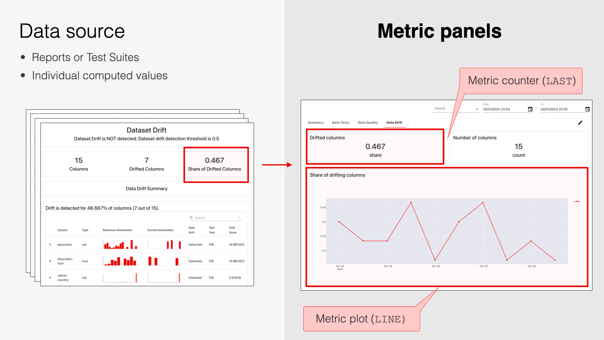 - When adding a Panel, you choose a Test or Metric with the specific value (“metric result”) inside it. Evidently pulls corresponding value(s) from all Reports in the Project and plots them on the Panel.