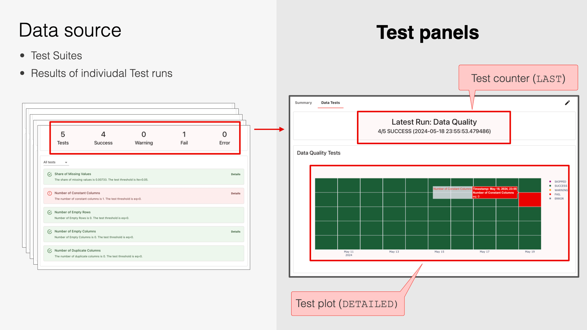panel_type=TestSuitePanelTypeAvailable: TestSuitePanelType.DETAILEDTestSuitePanelType.AGGREGATE | Defines the Panel type. Detailed shows individual Test results where you can hover and see individual results and click to open a corresponding Test Suite. Aggregate (default) shows the total number of Tests by status. |