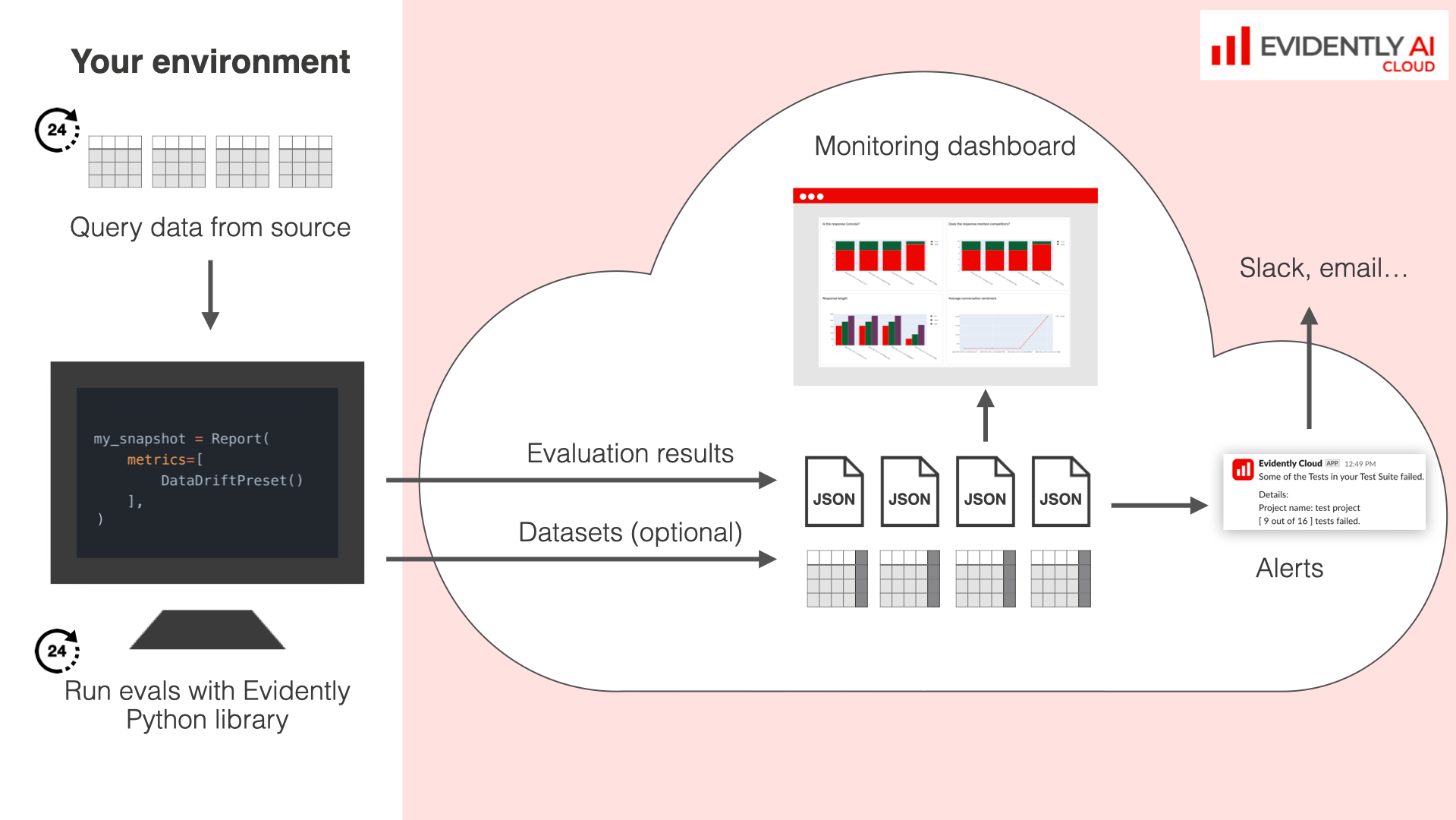 - first, send data quality, data drift and prediction drift checks