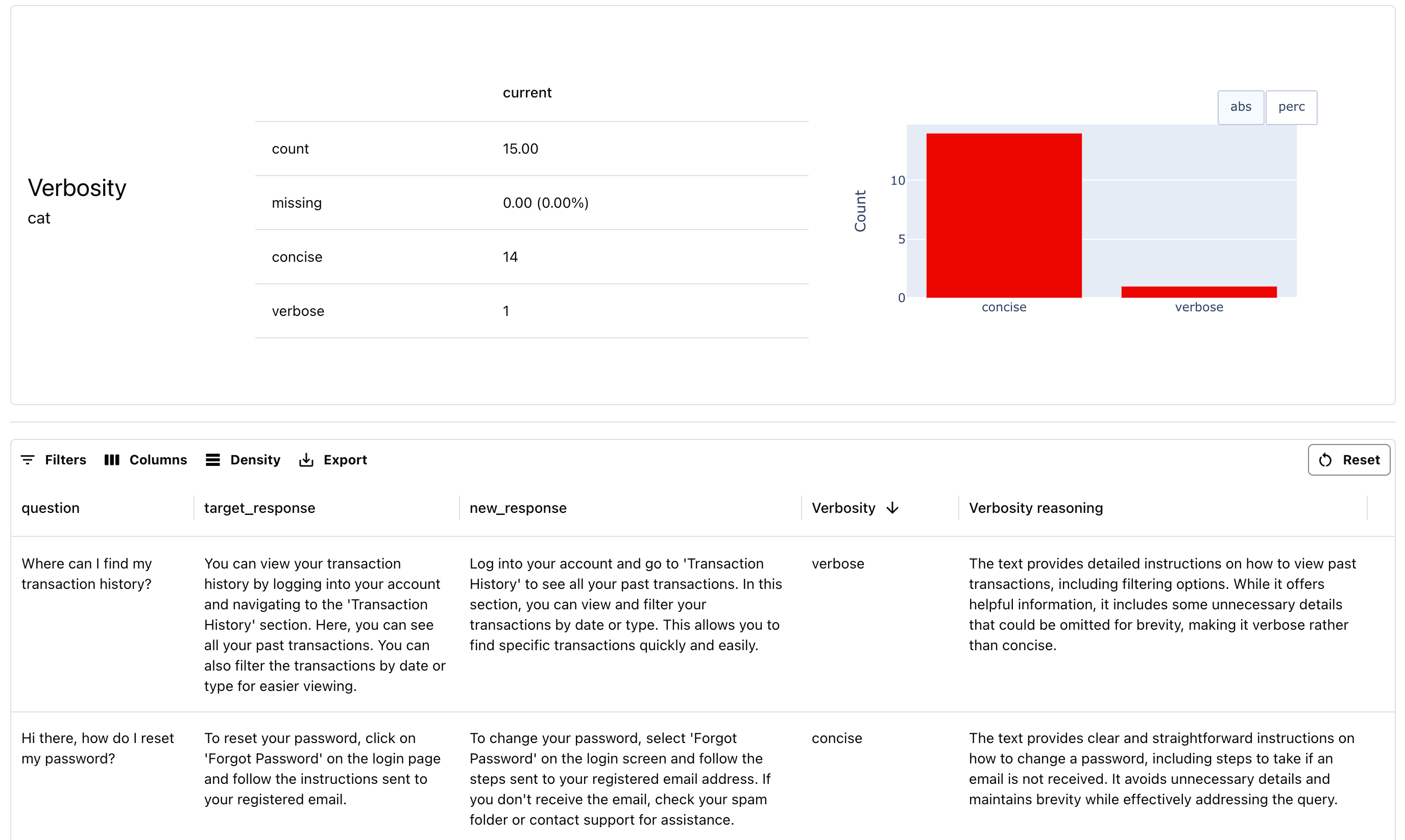 Next, let’s create a simpler verbosity judge. It will check whether the responses are concise and to the point. This only requires evaluating one output column: such checks are perfect for production evaluations where you don’t have a reference answer. Here’s how to set up the prompt template for verbosity: