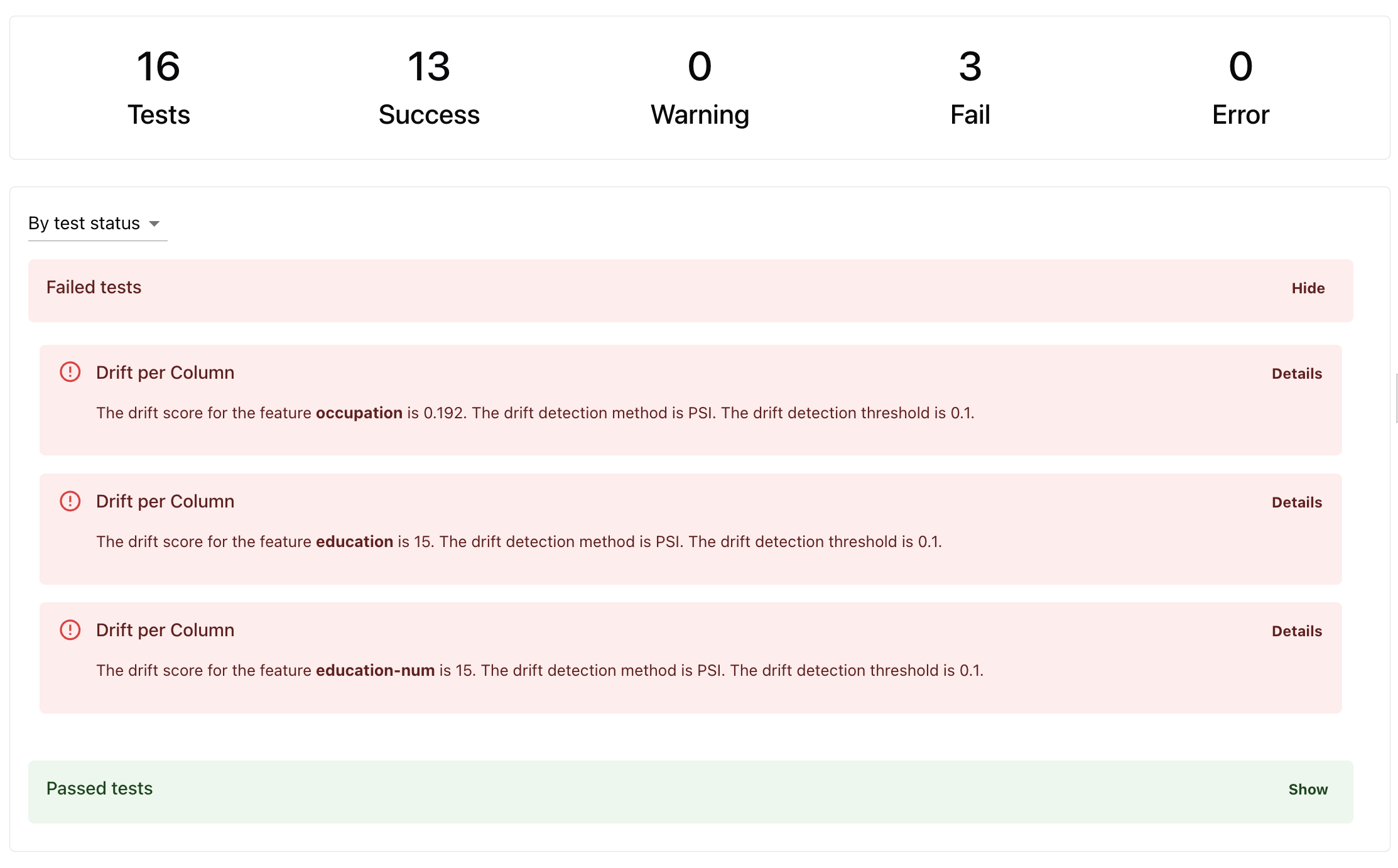 - Column drift. Checks for shifts in each column. The drift detection method is chosen automatically based on the column type and number of observations.