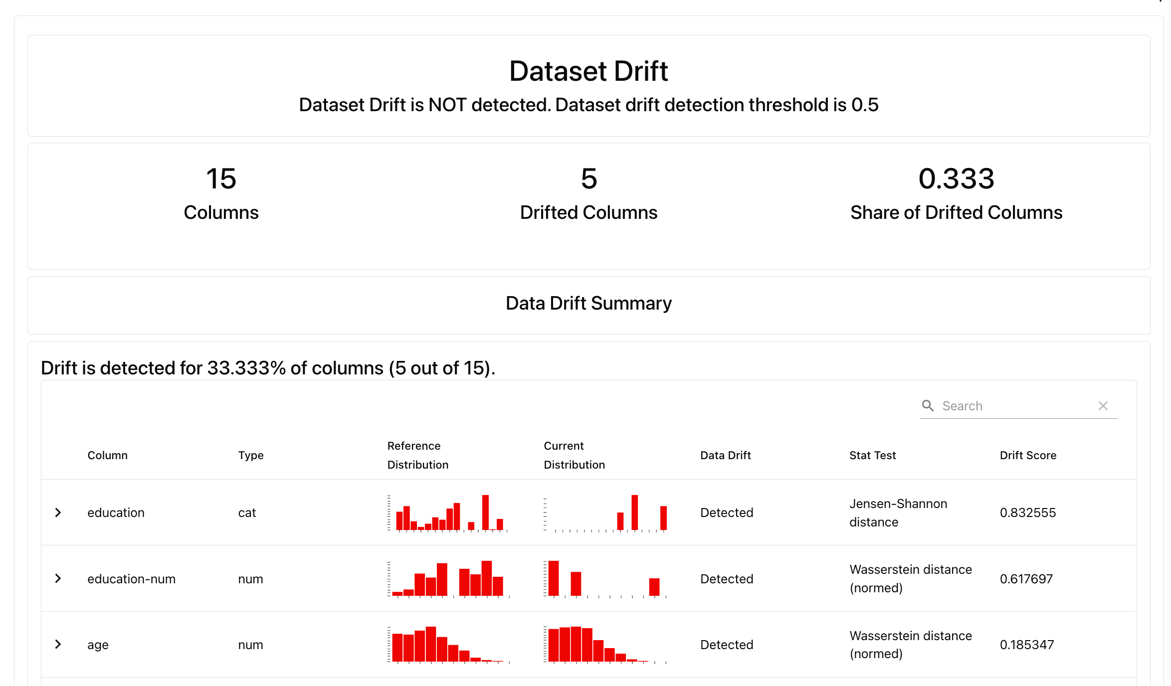 Let’s generate a Data Drift preset that will check for statistical distribution changes between all columns in the dataset.You can customize drift parameters by choosing different methods and thresholds. In our case we proceed as is so default tests selected by Evidently will apply.