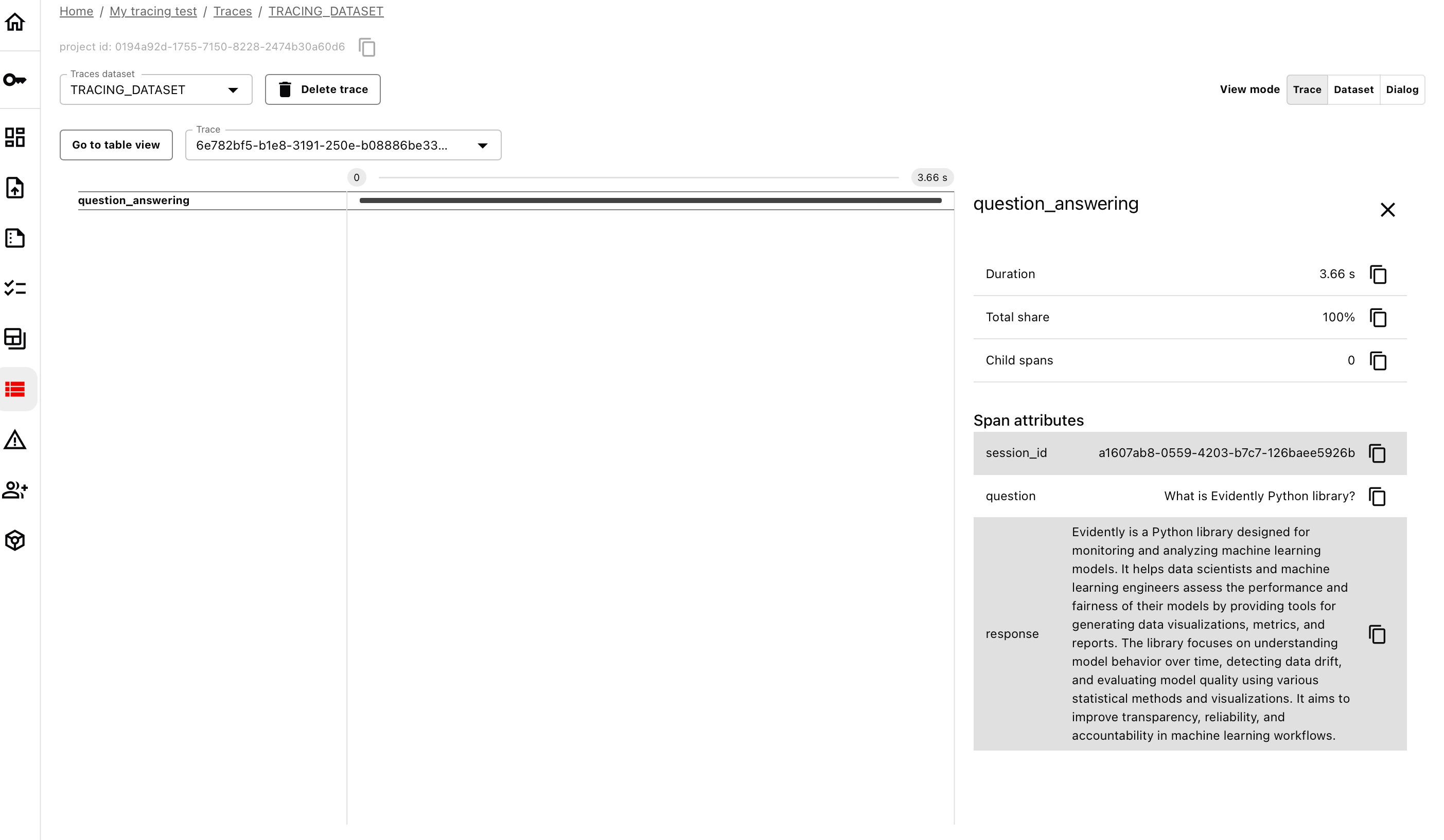 Go to the Evidently Cloud, open your Project, and navigate to the “Traces” in the left menu. Open the traces you just sent. It might take a few moments until OpenAI processes all the inputs. You can now view, sort, export, and work with the traced dataset. You can switch between Traces, Dataset and Dialog view (select session there).- Dialog