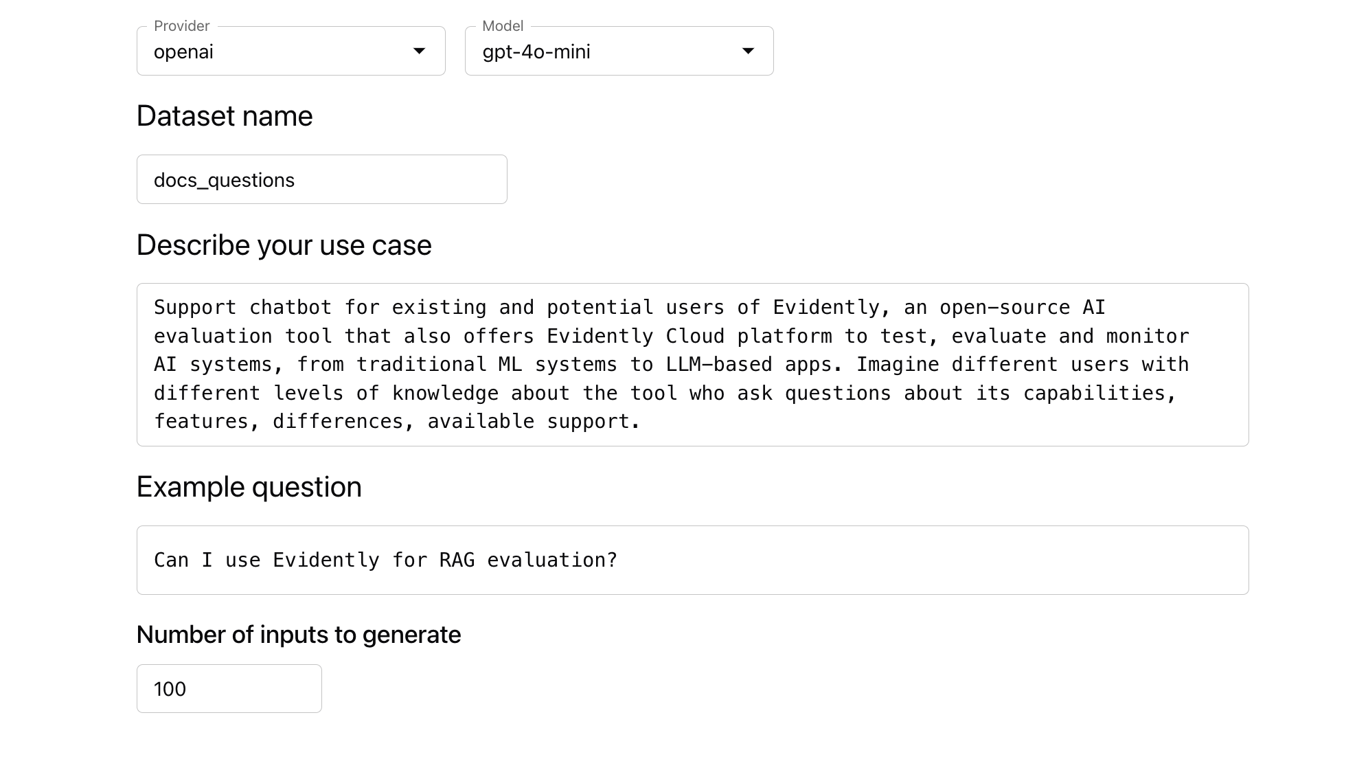 The system will generate a list of input questions based on your description. You can preview and refine the generated dataset.